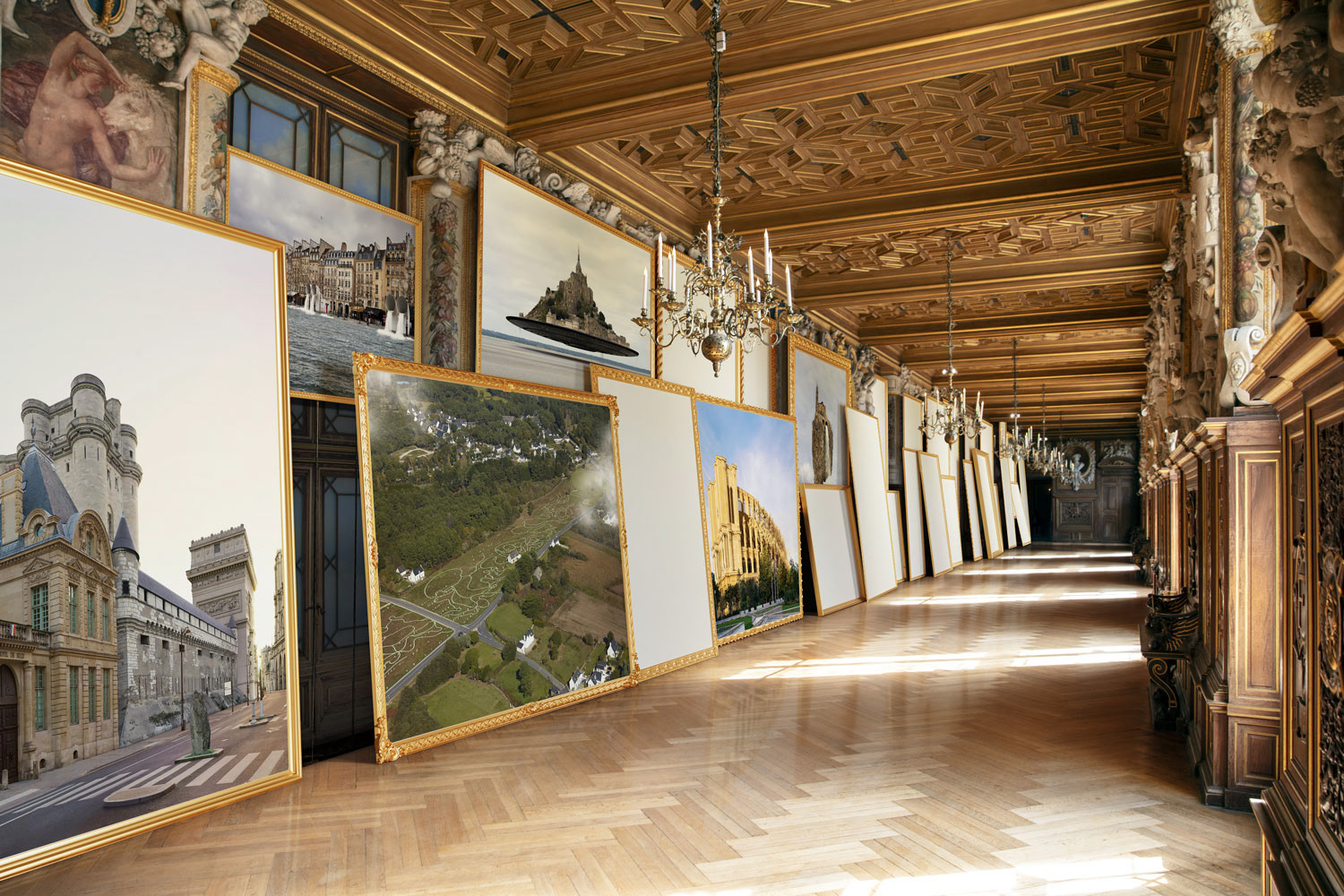 La Galerie François Iᵉʳ est ma galerie idéale. À la manière de Panini et de sa Galerie des vues de Rome, j’ai choisi ce lieu comme un espace symbolique où réunir mes Utopies Monumentales françaises. J’imagine les murs entièrement recouverts de cadres dorés, abritant mes visions de monuments français — un panorama intérieur, à la fois réel et imaginaire, où les siècles se superposent et où les monuments anciens retrouvent un futur.
